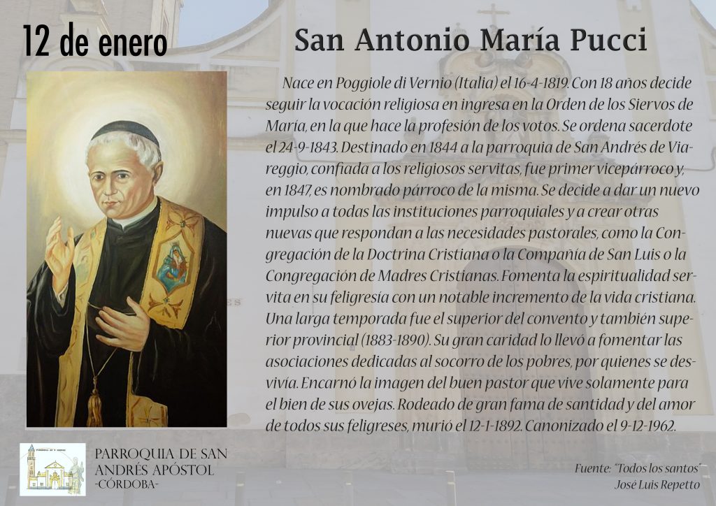 12-01 San Antonio María Pucci12 enero, 2019EditorsantoralSan Antonio María Pucci, santoral Comparte esto: Haz clic para compartir en X (Se abre en una ventana nueva) X Haz clic para compartir en Facebook (Se abre en una ventana nueva) Facebook Haz clic para compartir en WhatsApp (Se abre en una ventana nueva) WhatsApp Haz clic para compartir en Telegram (Se abre en una ventana nueva) Telegram Me gusta esto:Me gusta Cargando...
