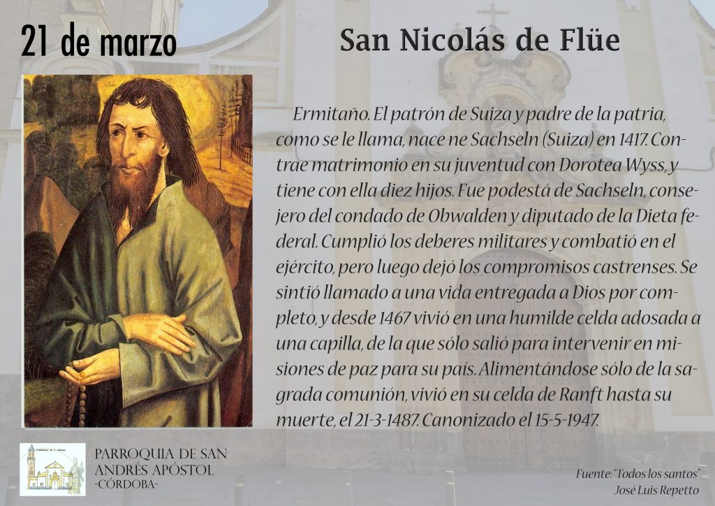 21-03 San Nicolás de Flüe21 marzo, 2019EditorsantoralSan Nicolás de Flüe, santoral Comparte esto: Haz clic para compartir en X (Se abre en una ventana nueva) X Haz clic para compartir en Facebook (Se abre en una ventana nueva) Facebook Haz clic para compartir en WhatsApp (Se abre en una ventana nueva) WhatsApp Haz clic para compartir en Telegram (Se abre en una ventana nueva) Telegram Me gusta esto:Me gusta Cargando...