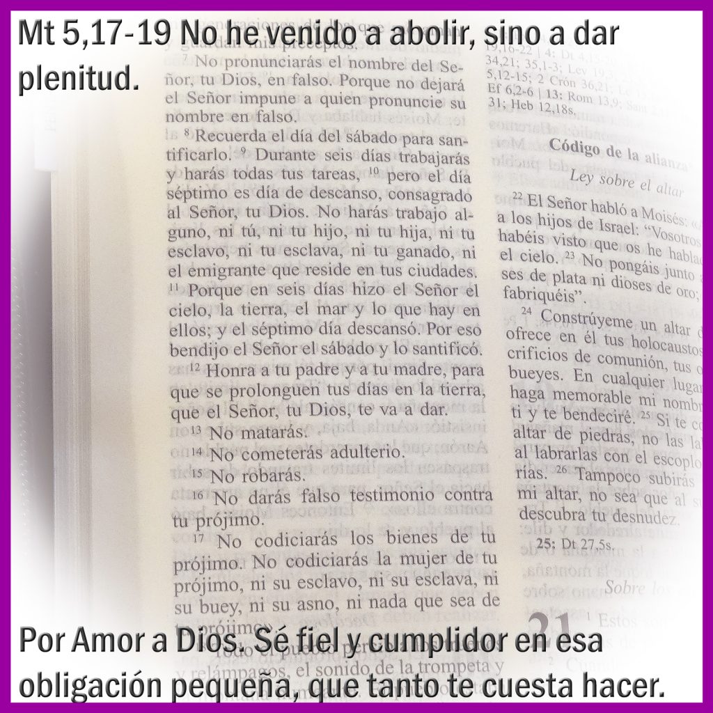 17 No creáis que he venido a abolir la Ley y los Profetas: no he venido a abolir, sino a dar plenitud. 18 En verdad os digo que antes pasarán el cielo y la tierra que deje de cumplirse hasta la última letra o tilde de la ley. 19 El que se salte uno solo de los preceptos menos importantes y se lo enseñe así a los hombres será el menos importante en el reino de los cielos. Pero quien los cumpla y enseñe será grande en el reino de los cielos.